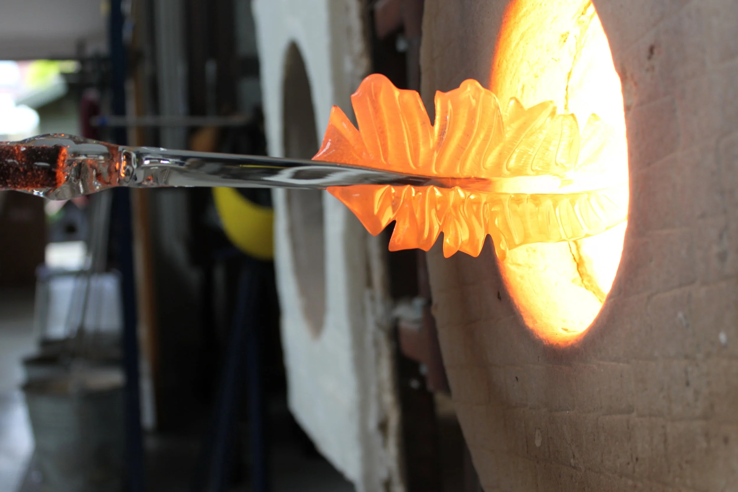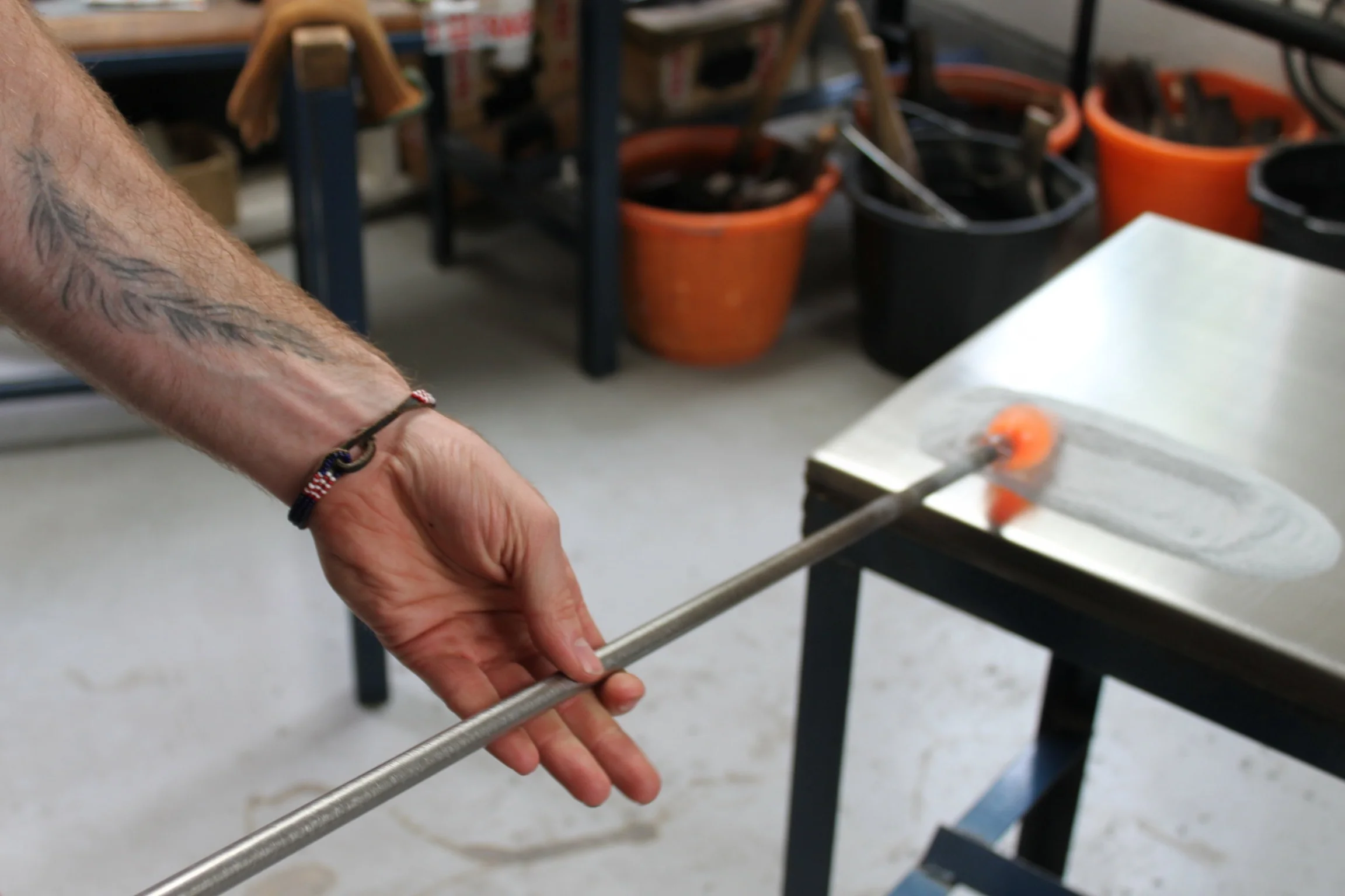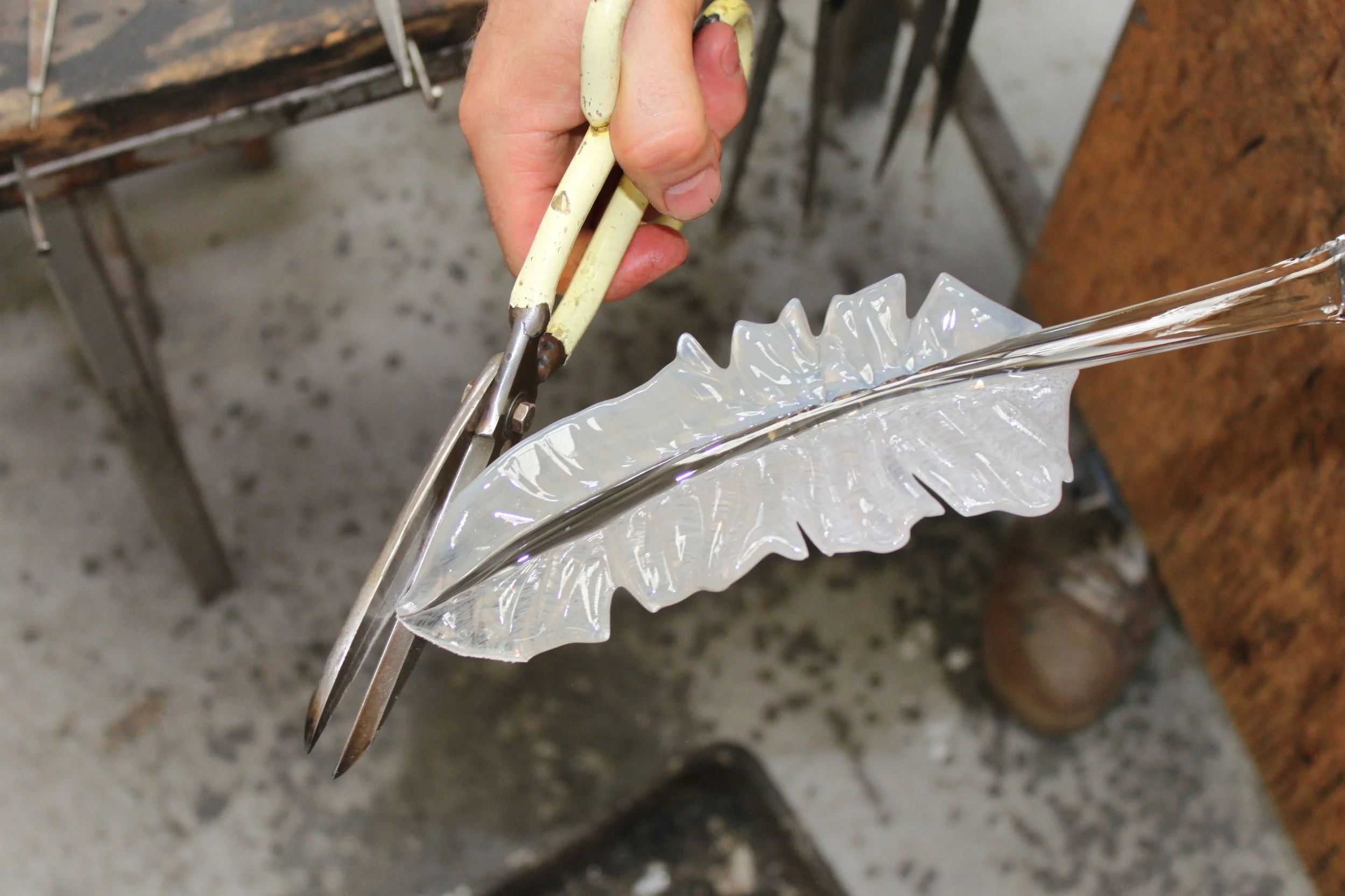 first step, is to make a stem for the vanes of the feather to adhere to. This is done with a small gather of clear glass from the furnace which is then flattened and stretched using shears to elongate it and get the desired shape of the stem.